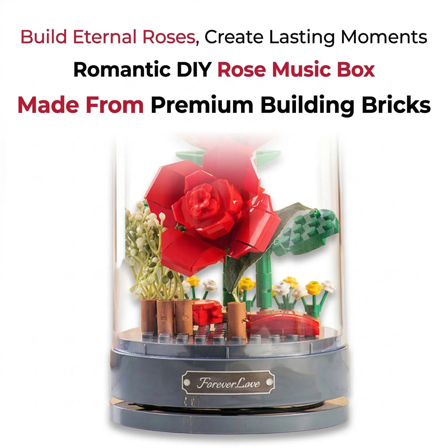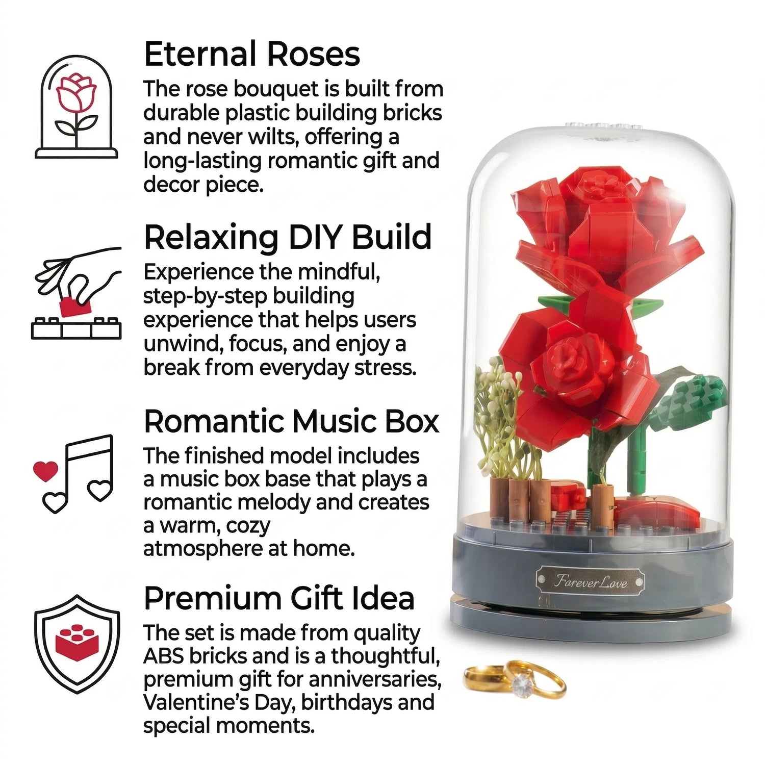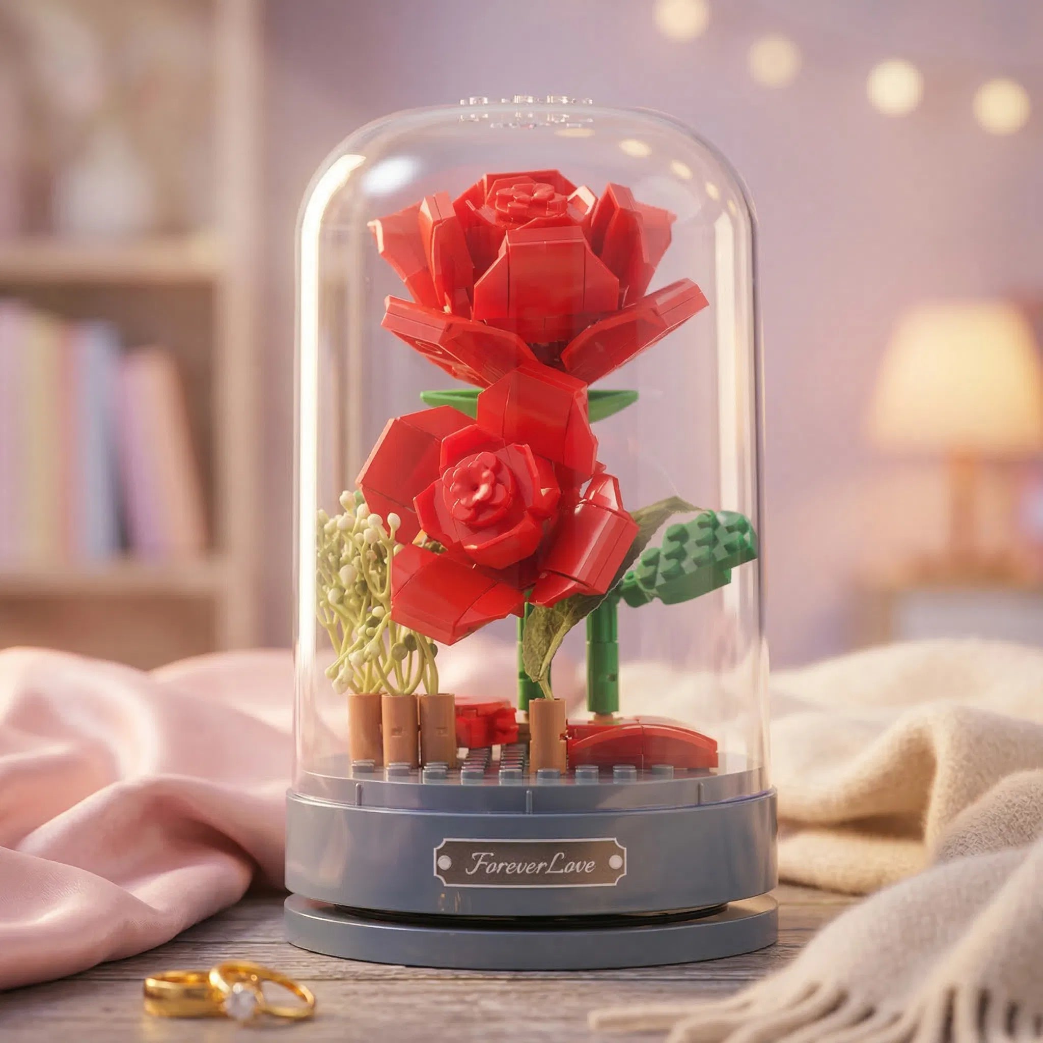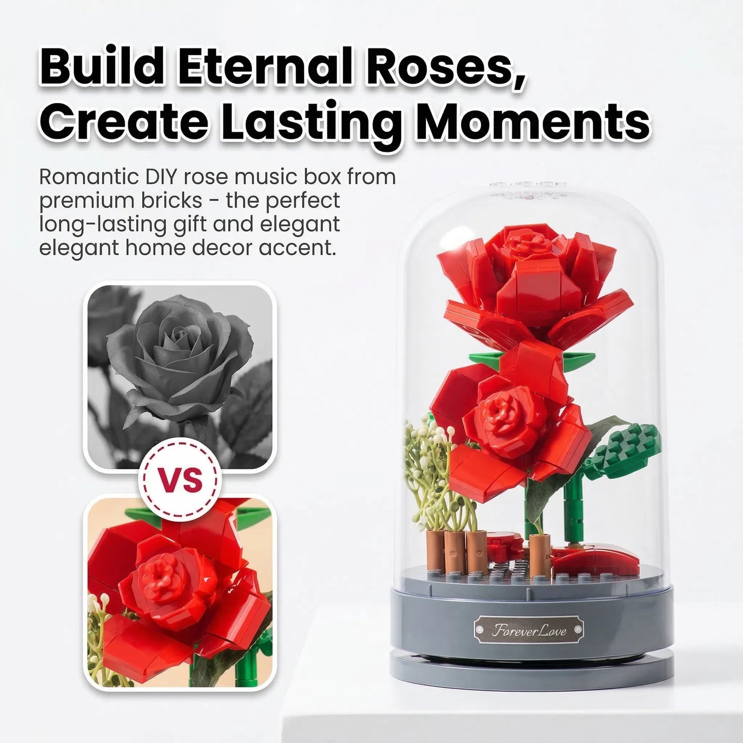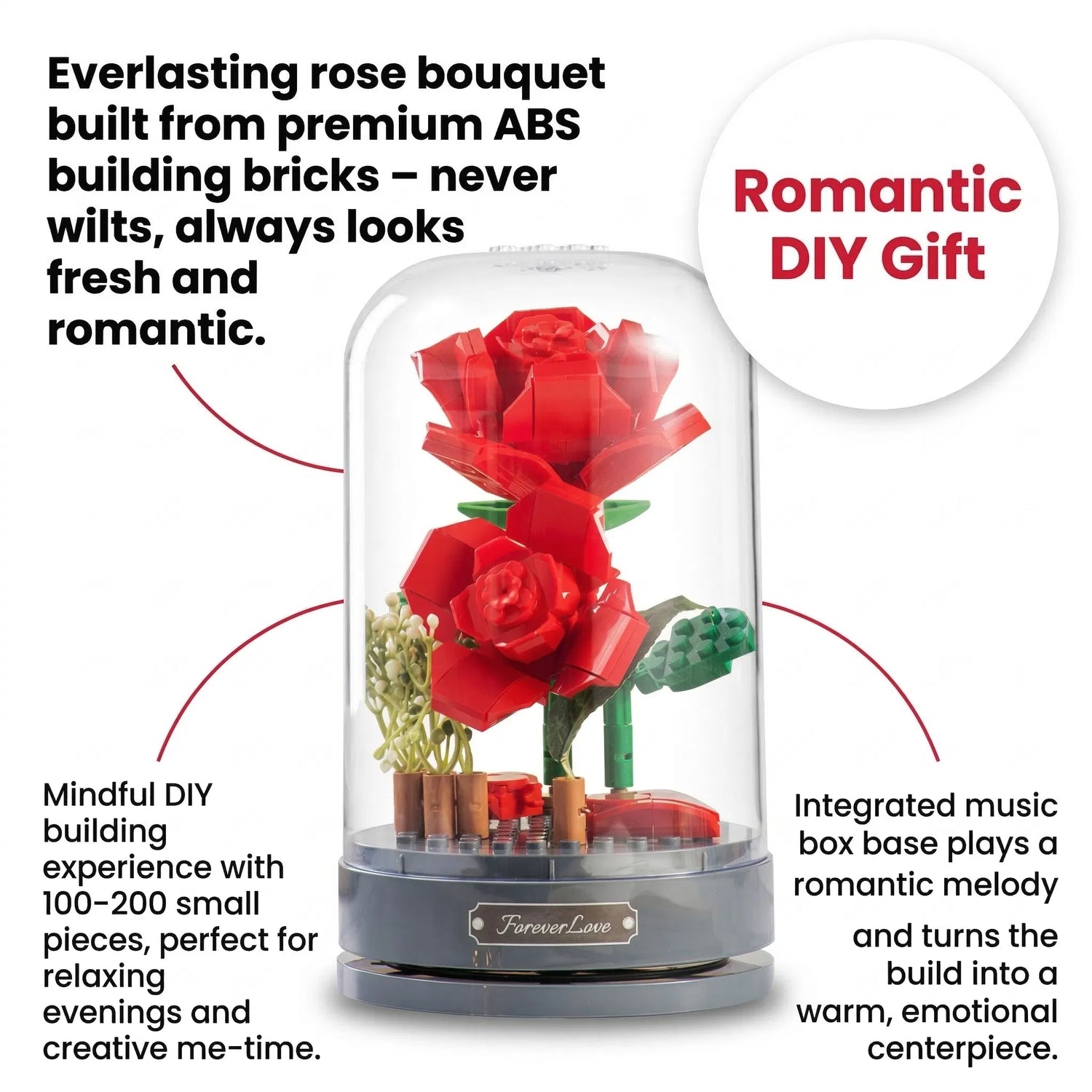 S touto hudební krabičkou s růžemi z kostek spojíte kreativní radost ze stavění s nadčasovým dárkem. Z kvalitních ABS kostek postavíte elegantní květinu v něžné scéně na hudební krabičce – ideální jako dekorace, noční světlo nebo výjimečný dárek pro vaše blízké.