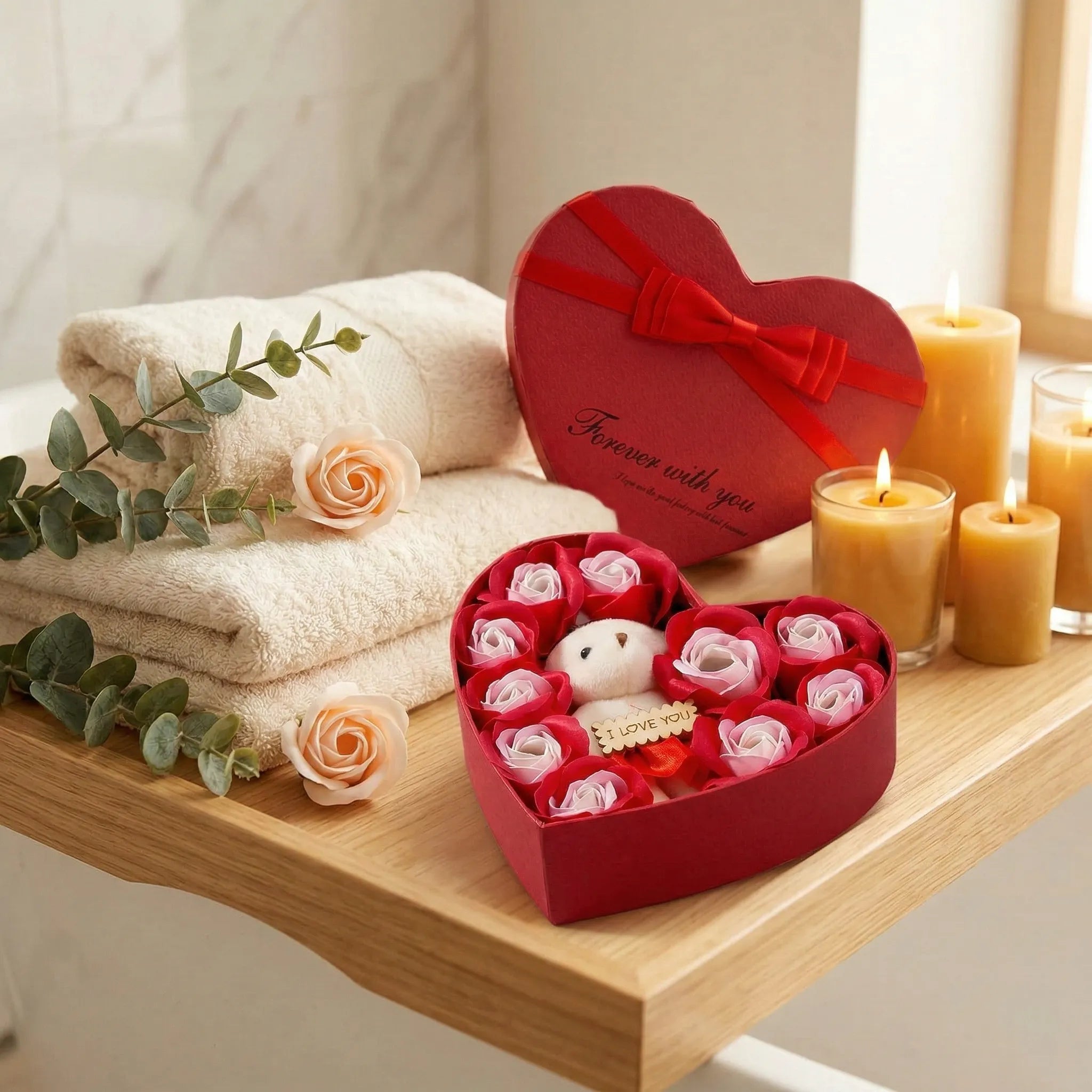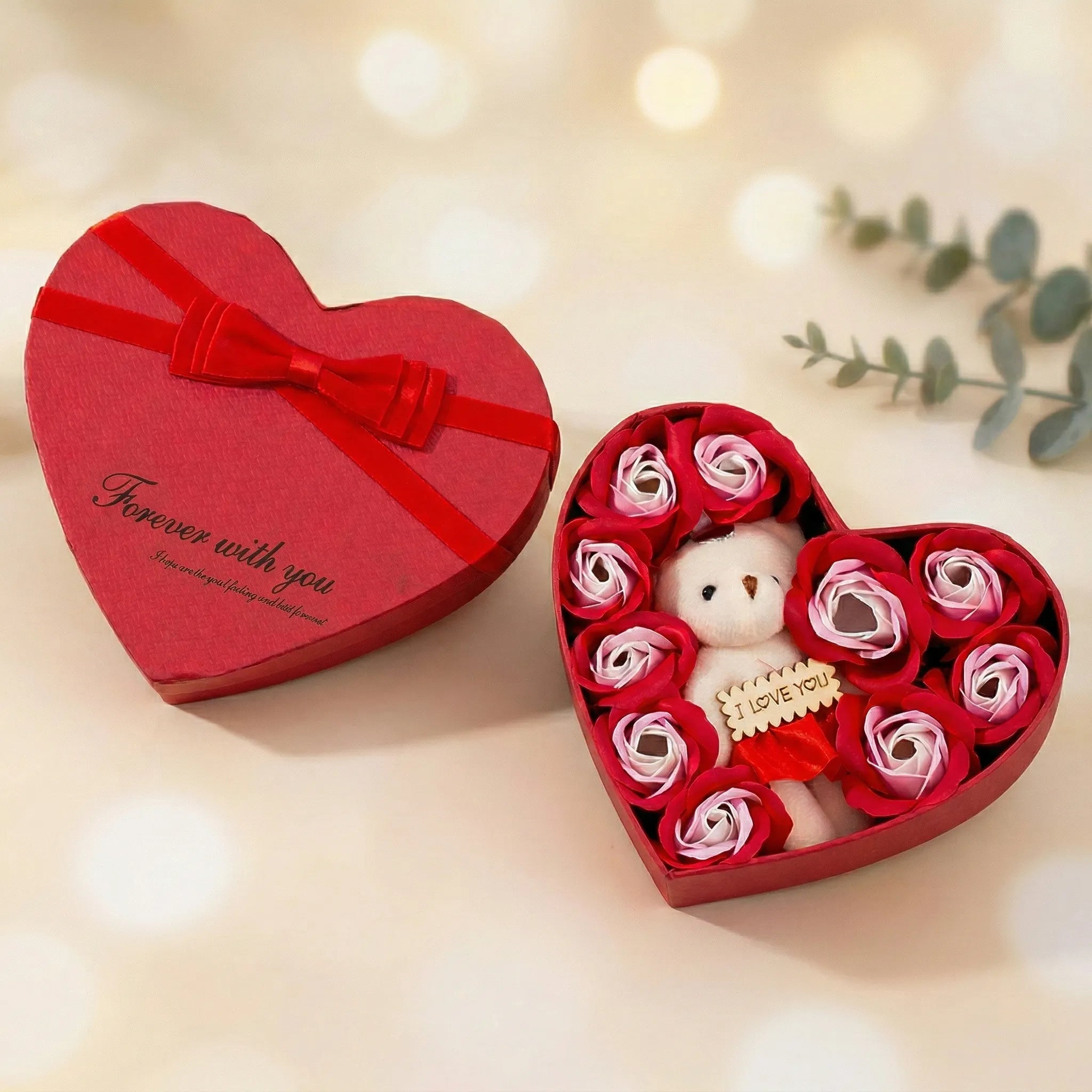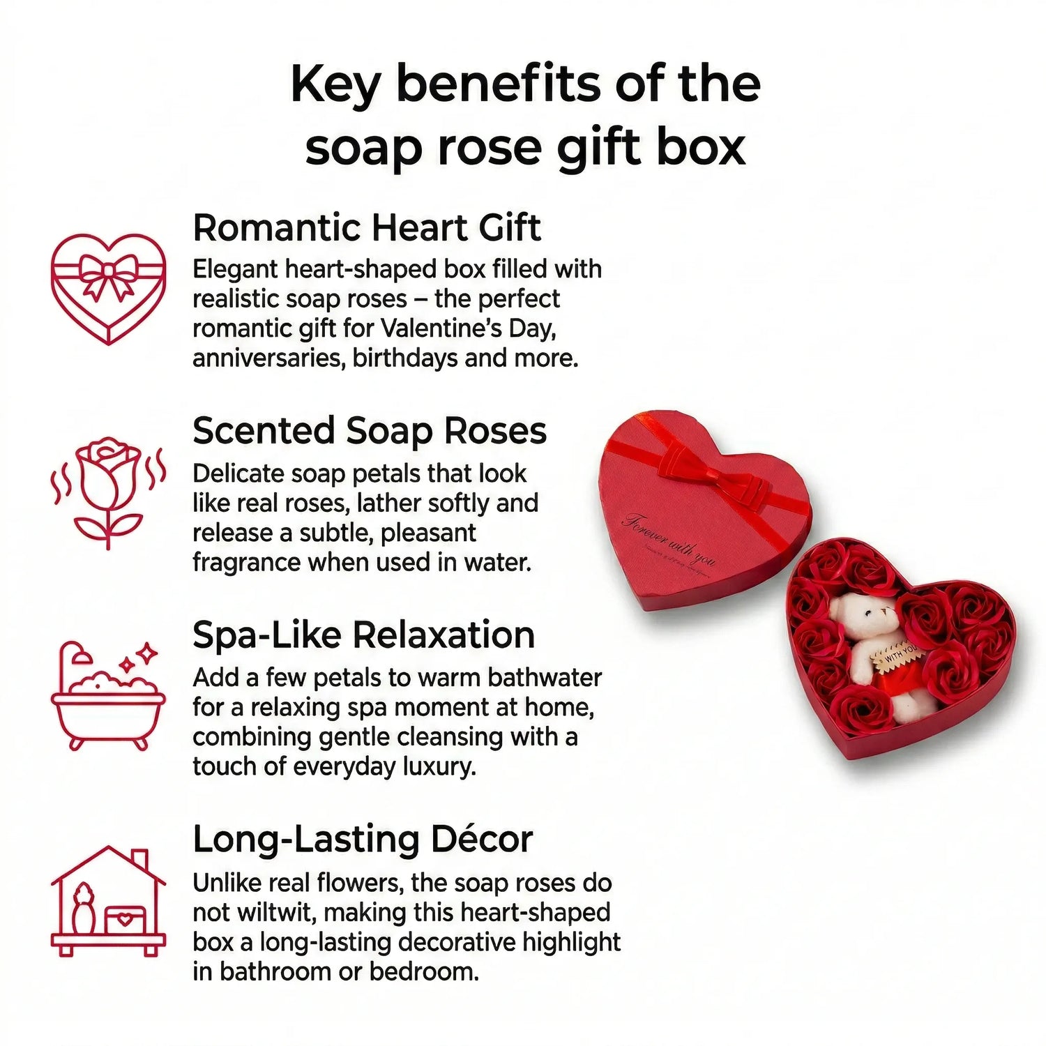 - Obsah balení: 1x dárková krabička ve tvaru srdce s mýdlovými růžemi a medvídkem