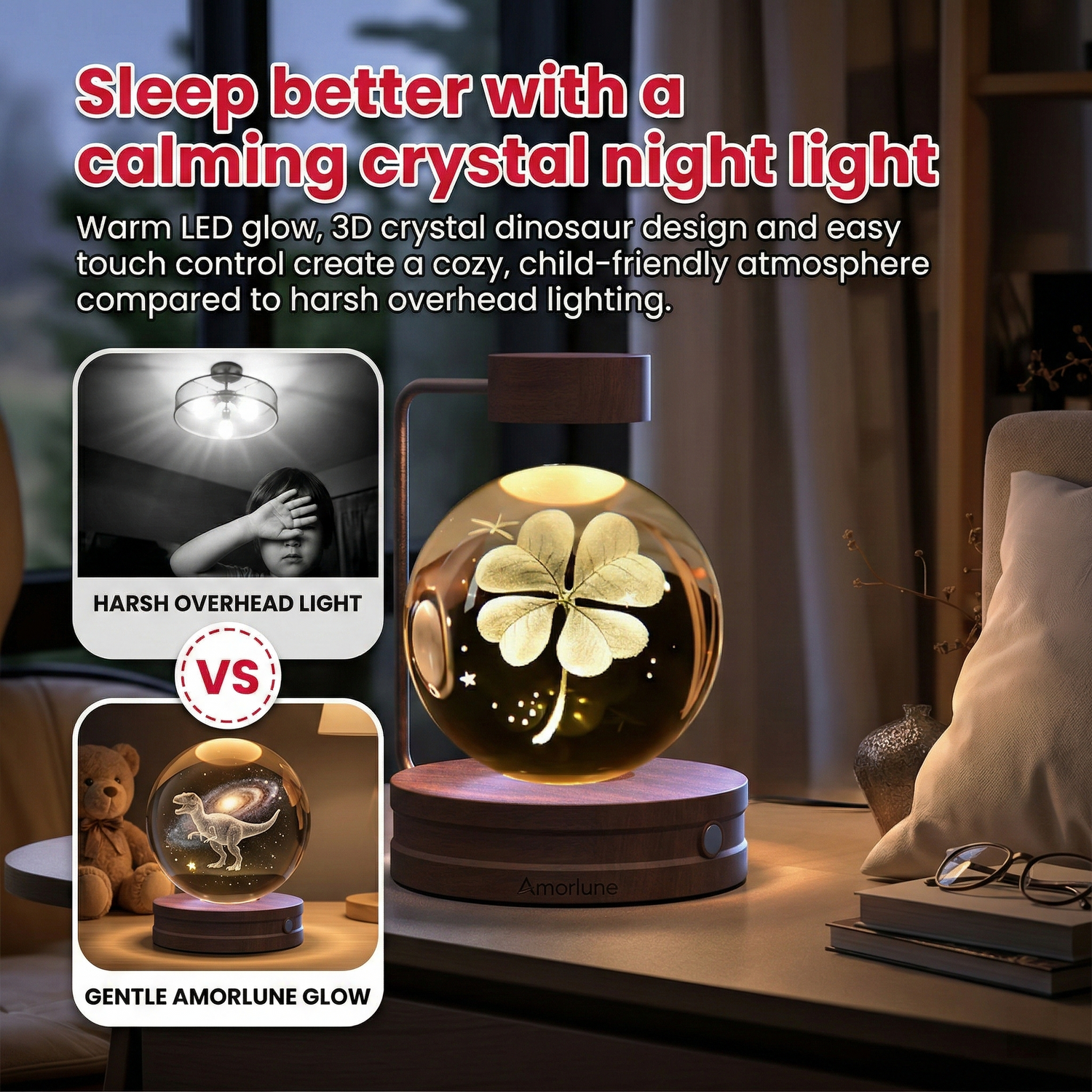 Add a magical touch to your home: Our Crystal Night Light Dino Galaxy combines a clear, light-refracting crystal sphere with a cute dinosaur motif and warm white LED light. Ideal as a night light for the bedroom, children's room, or living room.