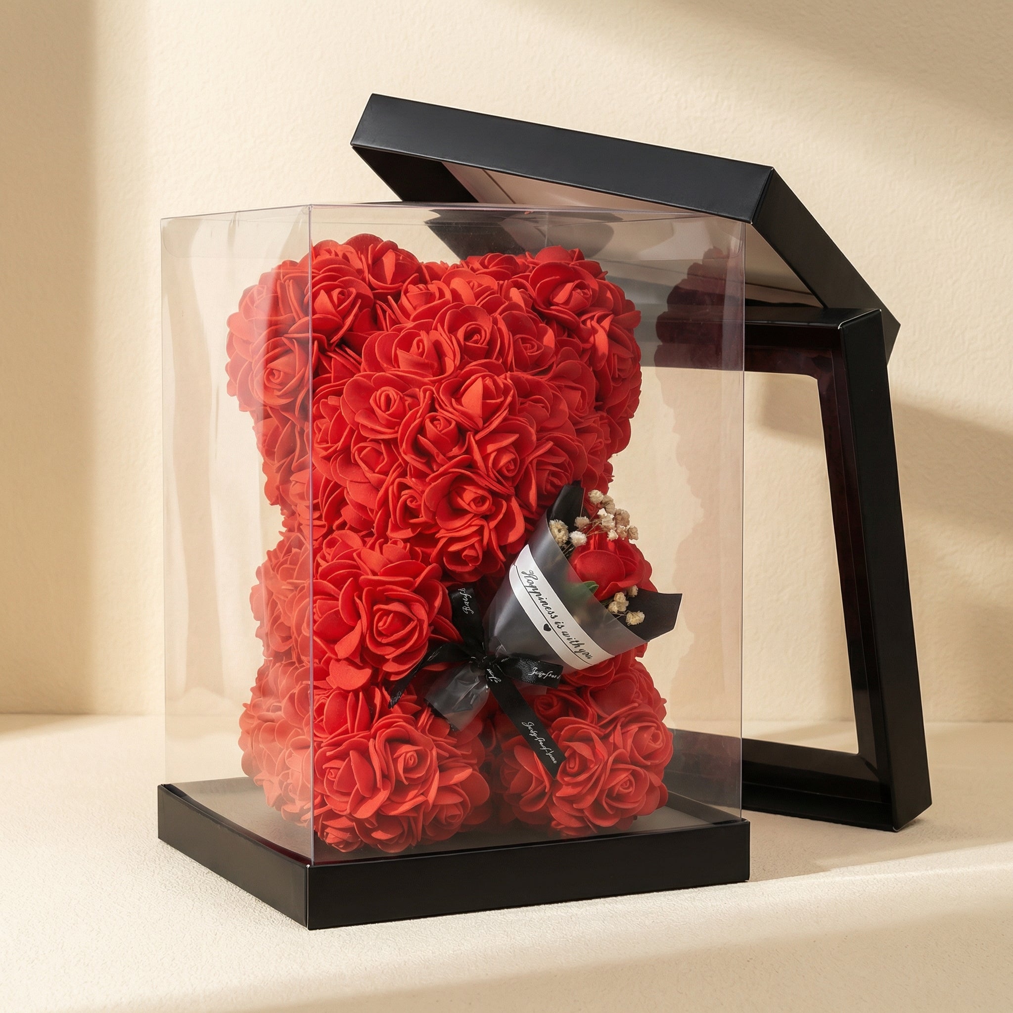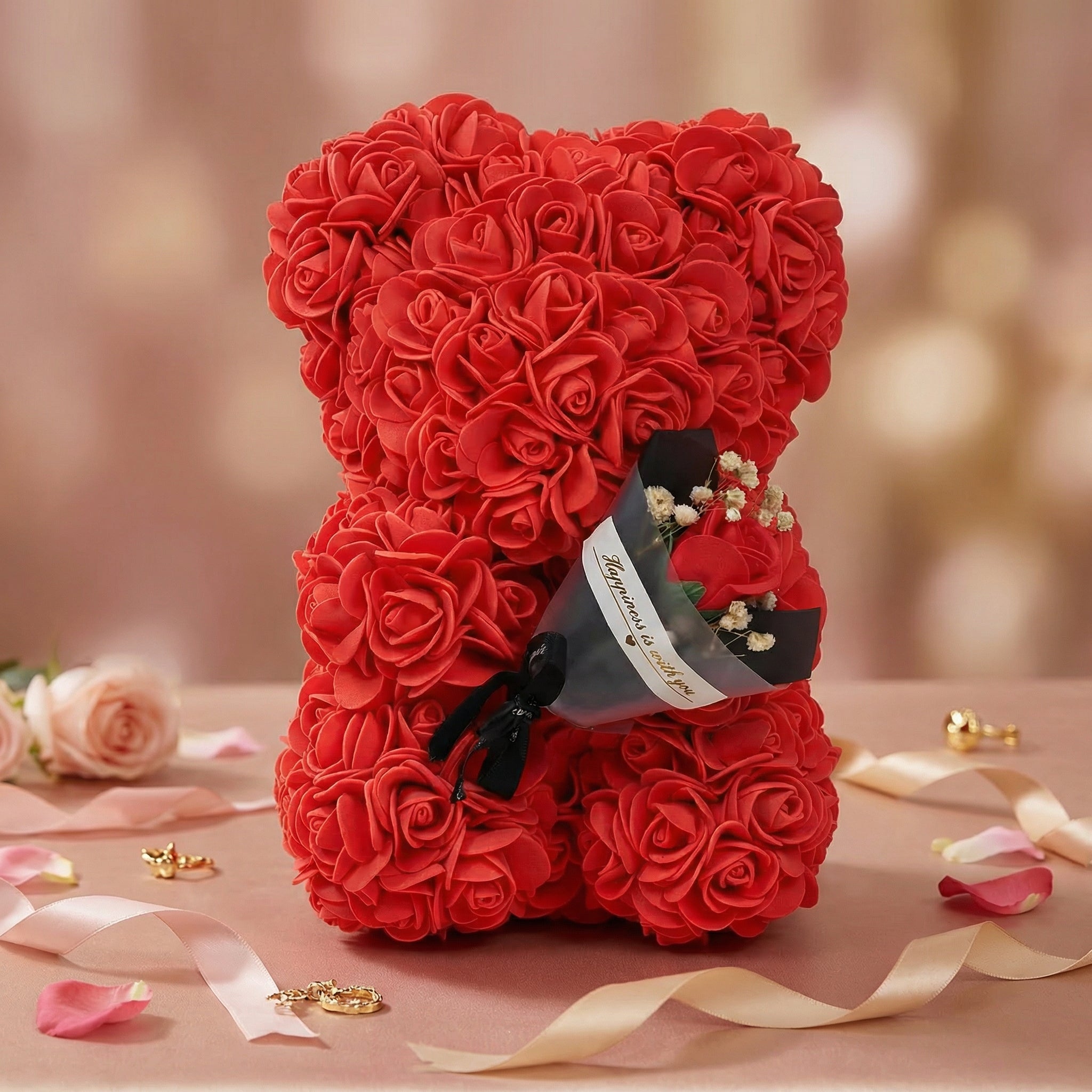 For a large rose bear, usually between 200 and 500 artificial roses are needed depending on the size and model. The exact number depends on the size of the bear and the density of the arrangement. A typical 40 cm rose bear consists of about 250–300 roses.