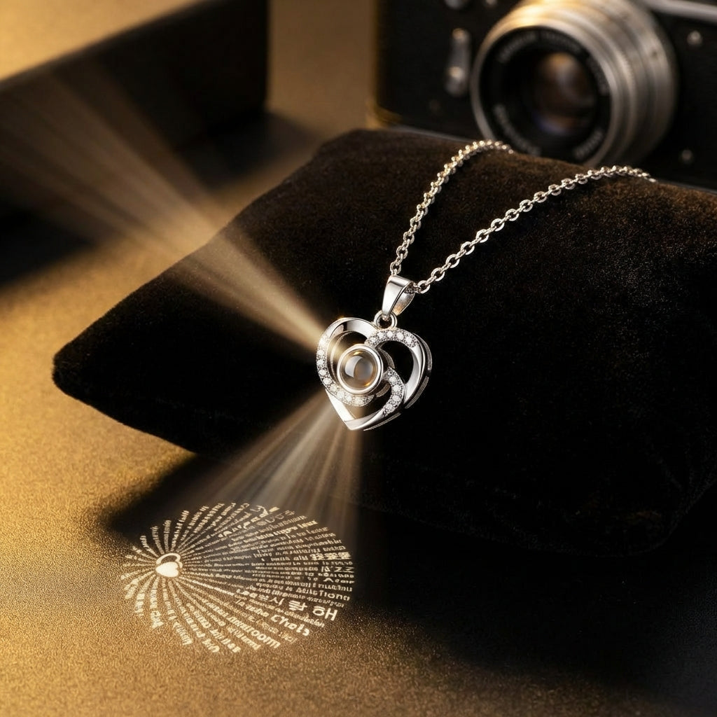 Die beiliegende Herzkette trägt eine geheime Botschaft: „Ich liebe dich“ in 100 verschiedenen Sprachen, sichtbar mit Licht oder Kamera – ein emotionales Highlight für jeden Beschenkten.
