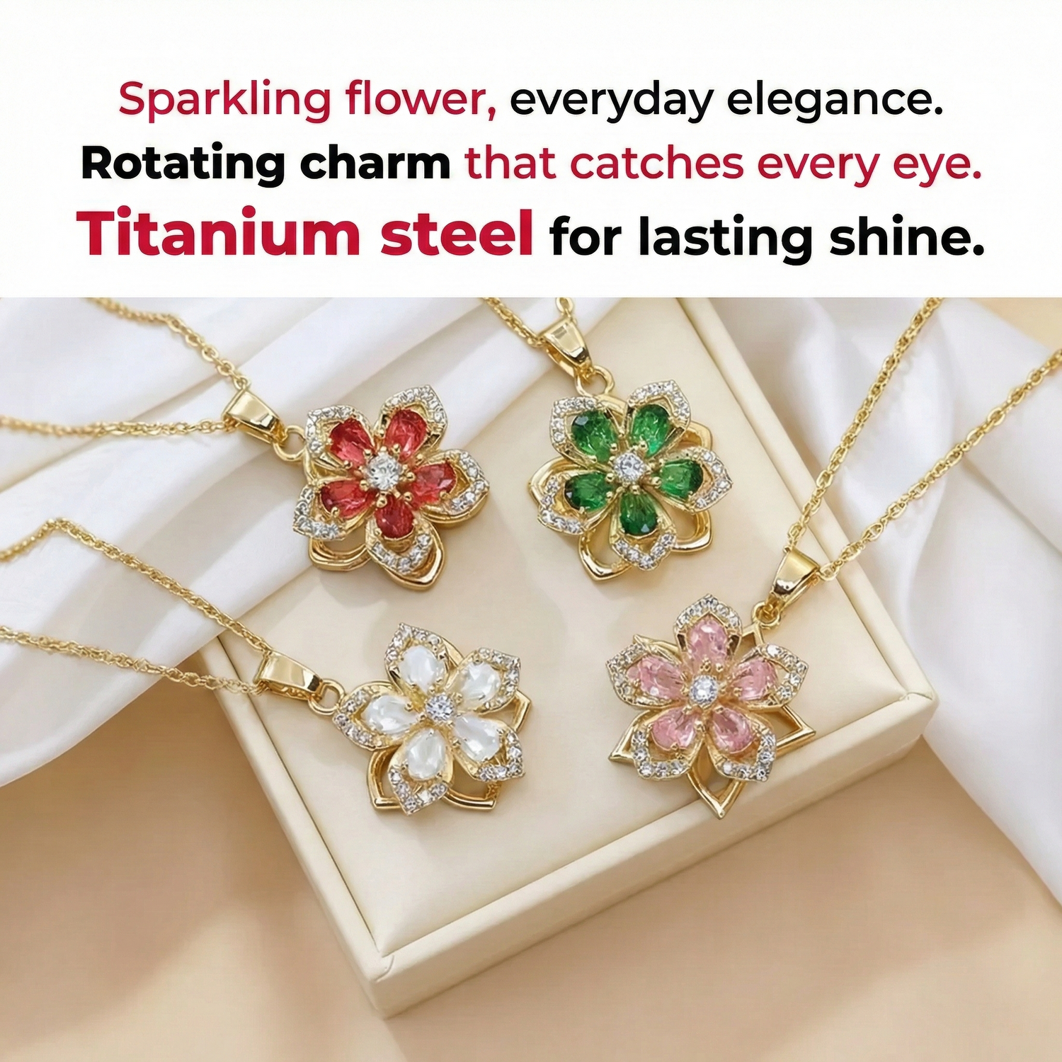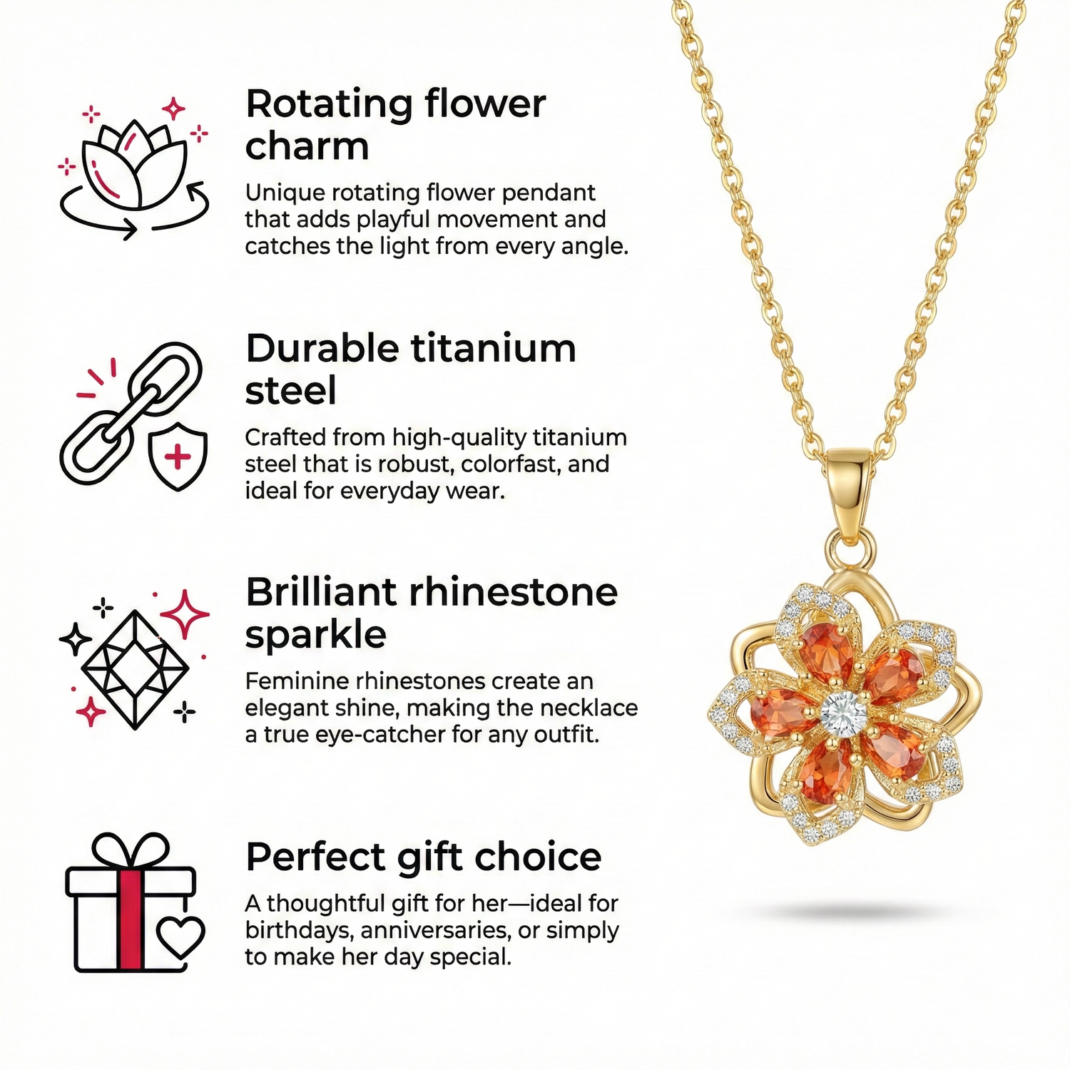 El material de acero de titanio de alta calidad es resistente, mantiene el color y resulta cómodo de llevar. El elemento floral giratorio crea un efecto juguetón y único que convierte este collar en un detalle especial que llama la atención.