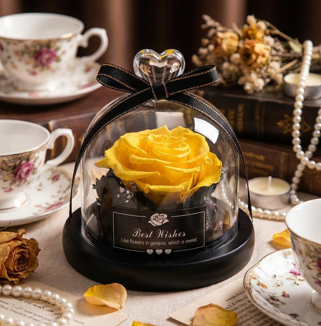 La rosa preservada permanece bella indefinidamente y es símbolo de sentimientos eternos.