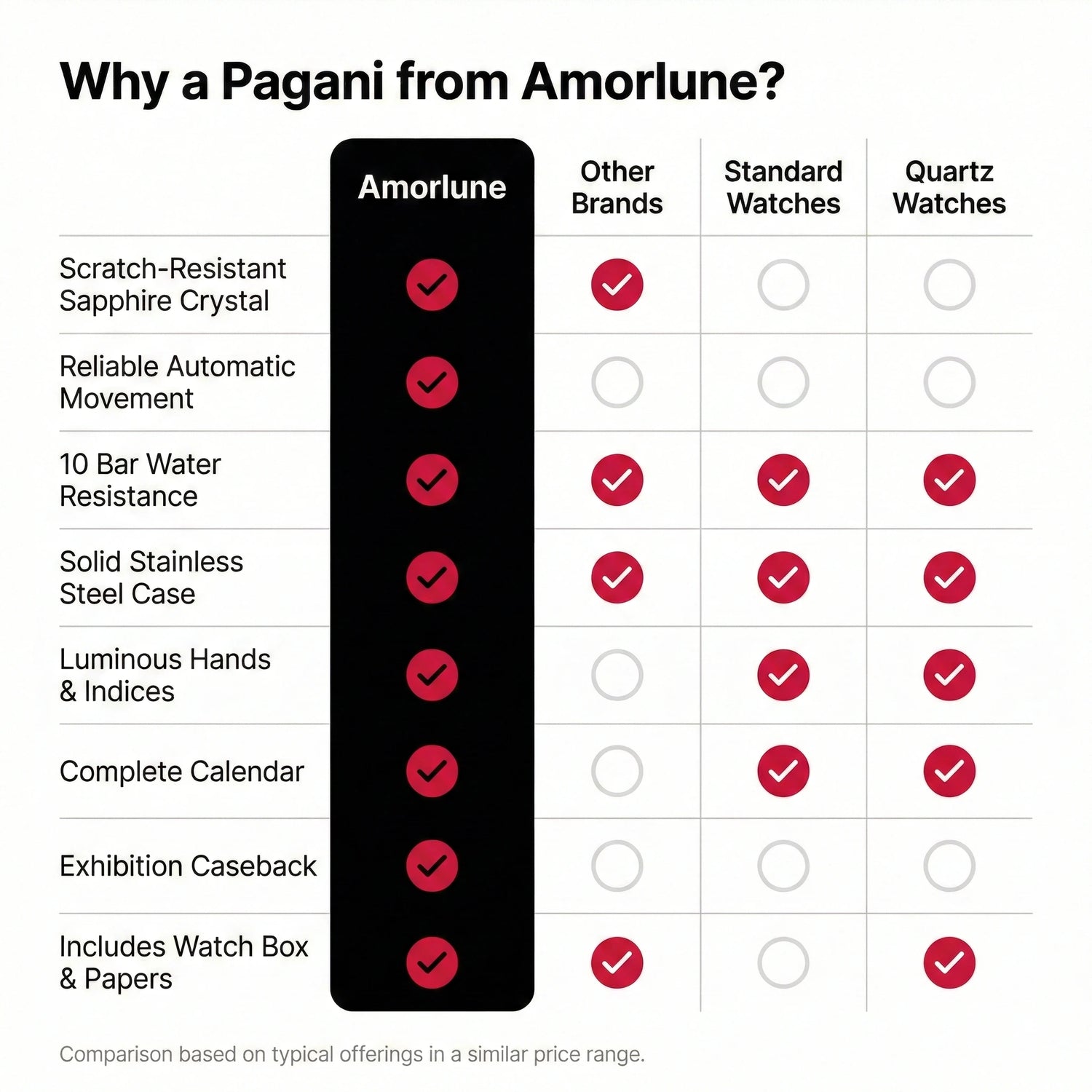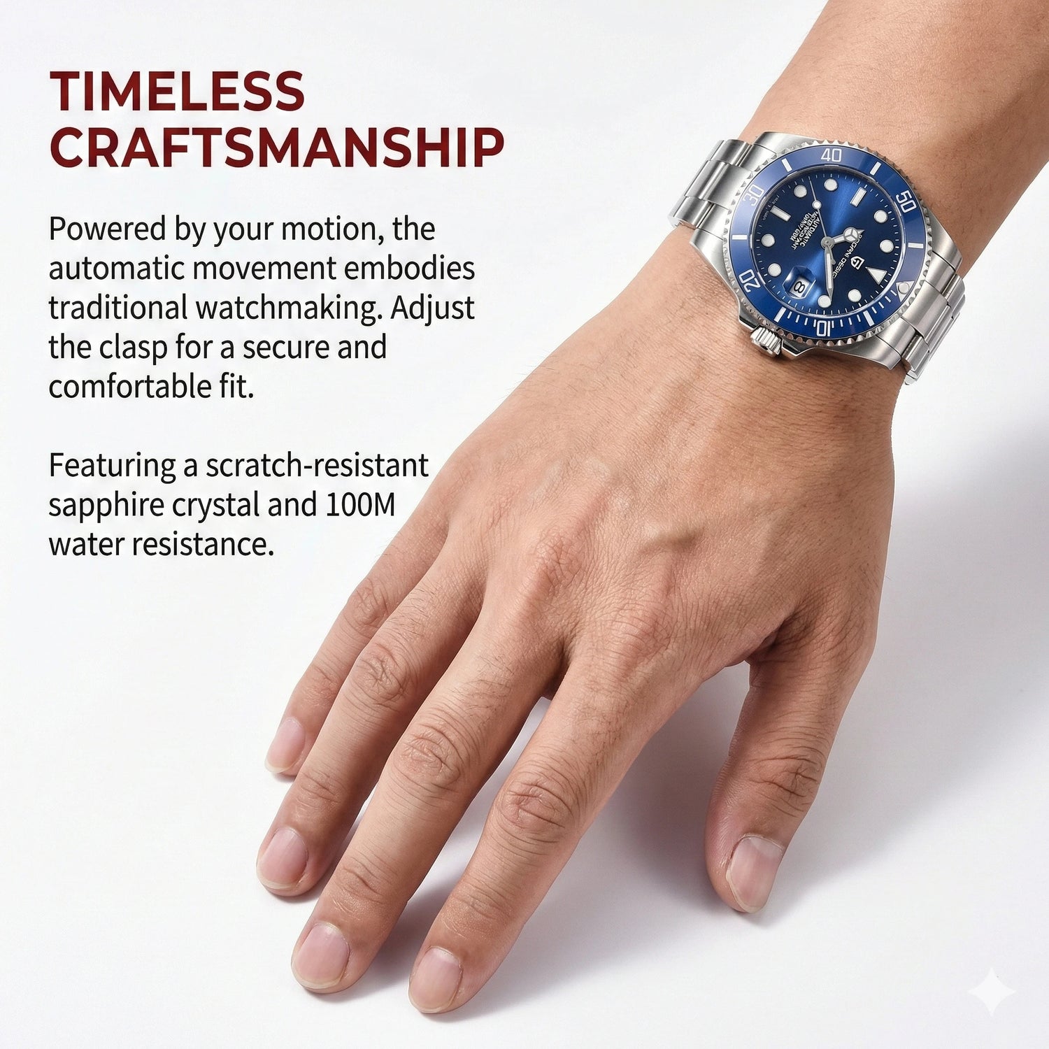 - Meccanismo automatico: Alimentato dal movimento del polso – senza bisogno di batteria.