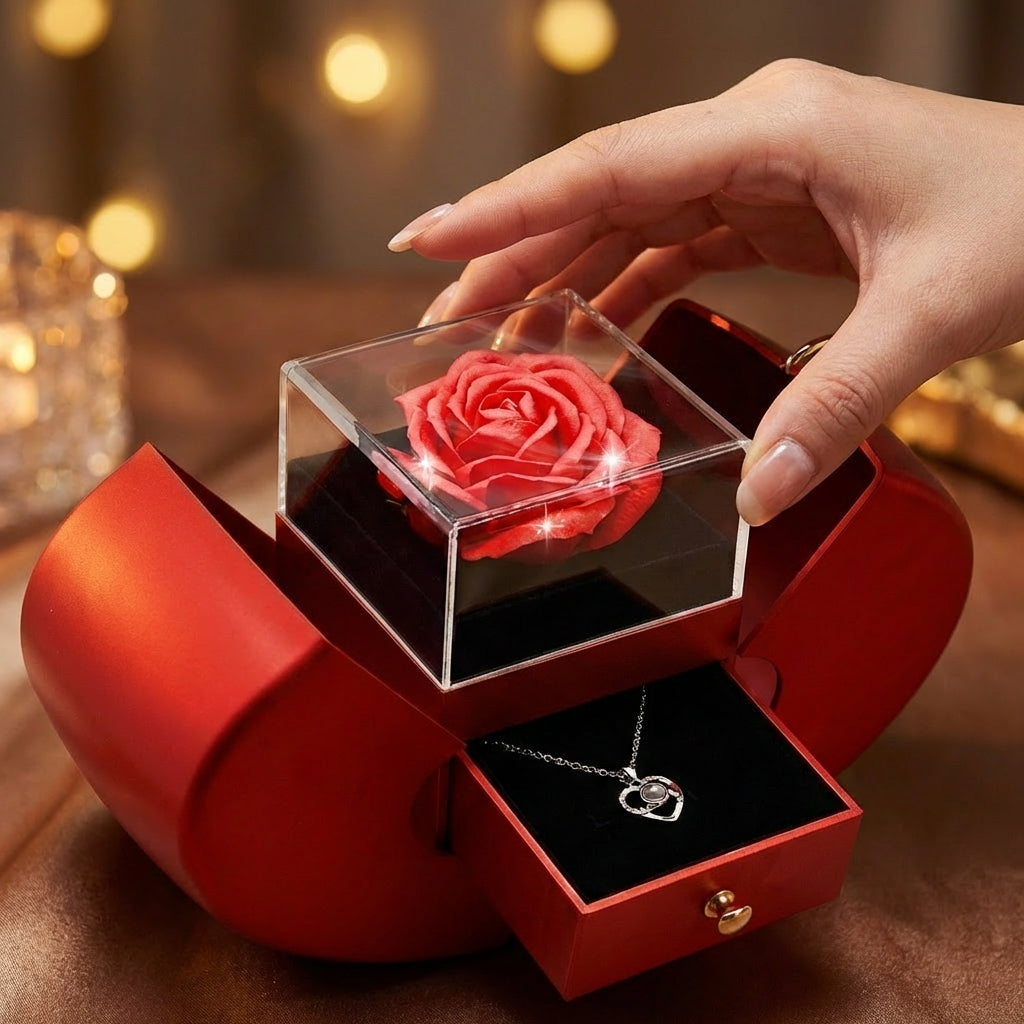 Ewige Rosen Geschenkbox "Appel" met „Ik hou van jou“-Halsketting in 100 talen