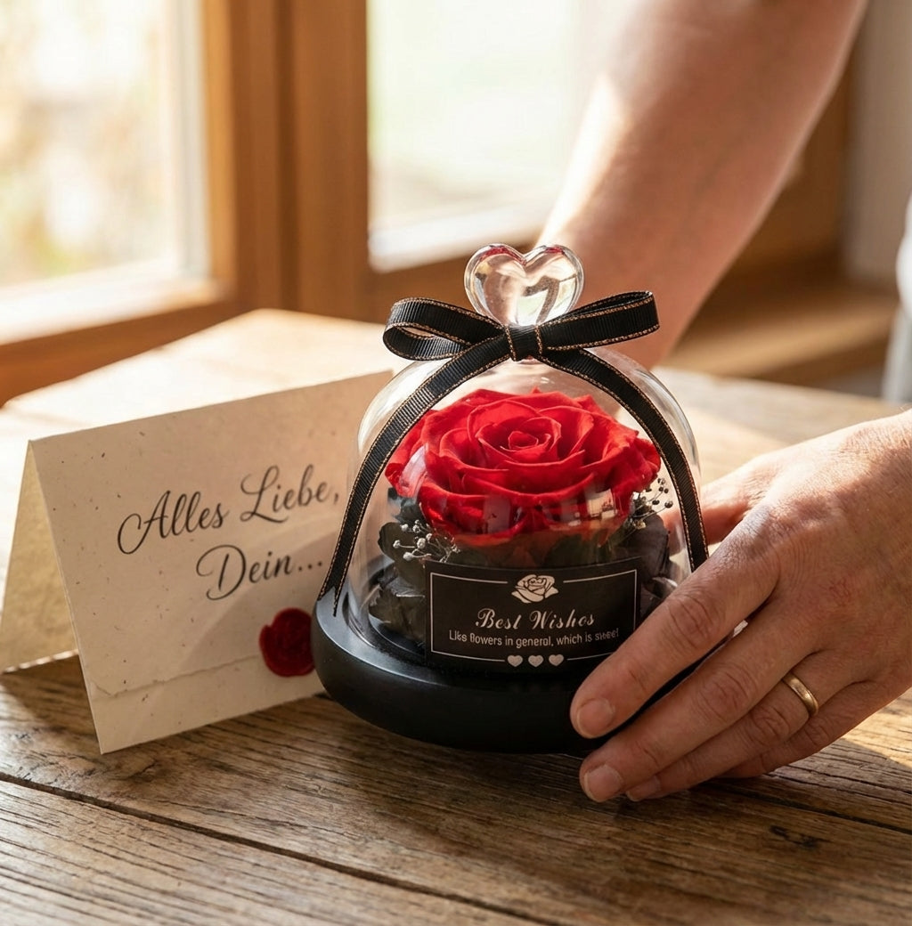 Konservierte Ewige Rose in Glaskuppel von Amorlune, elegant präsentiert mit klarer Glaskuppel und lebendigen Blüten.