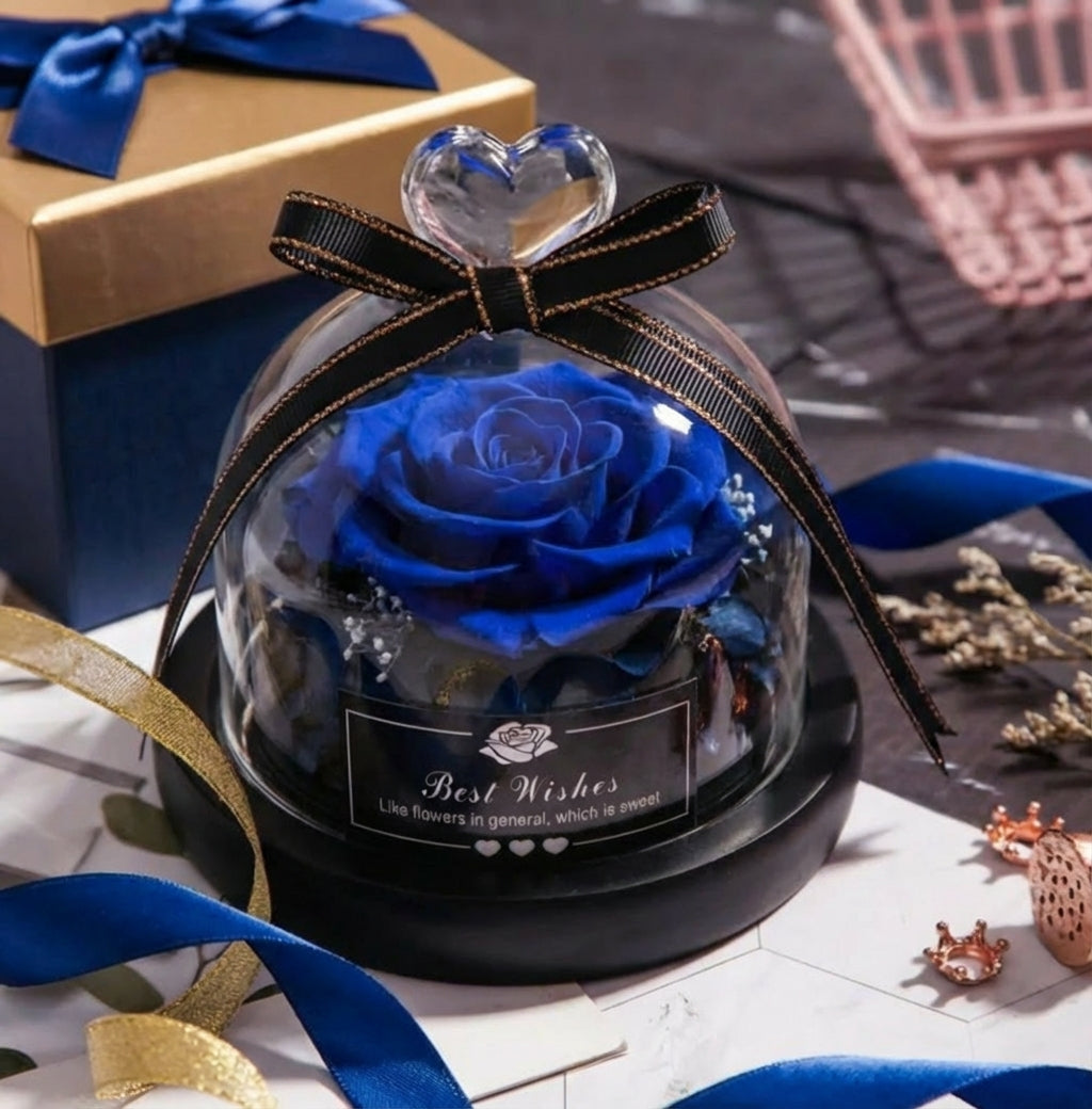 Róża w szklanej kopule symbolizuje wieczną miłość, trwałość i romantyzm. Jest inspirowana baśnią „Piękna i Bestia” i uważana za znak ponadczasowego piękna oraz nieprzemijających uczuć – popularny podarunek na wyjątkowe okazje.