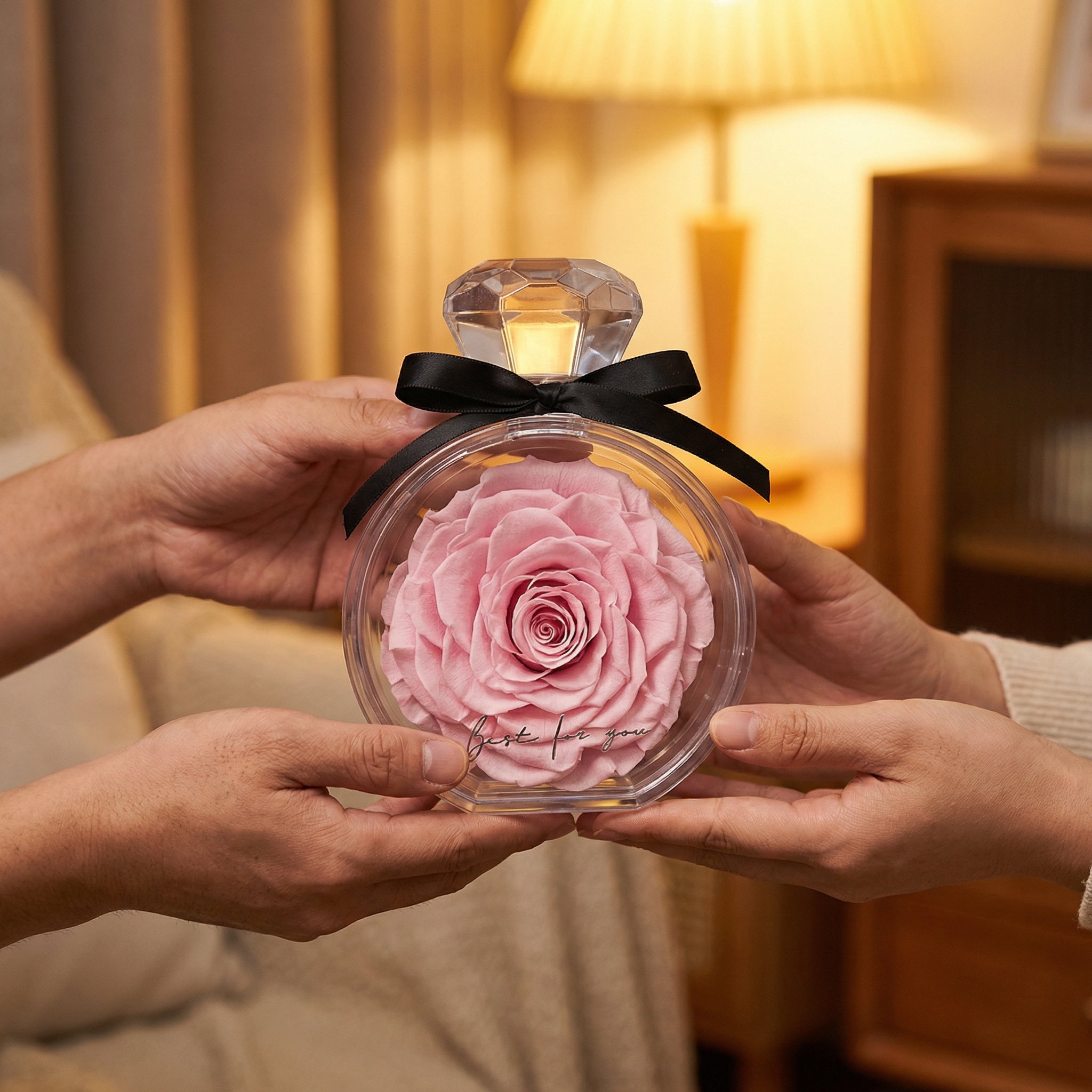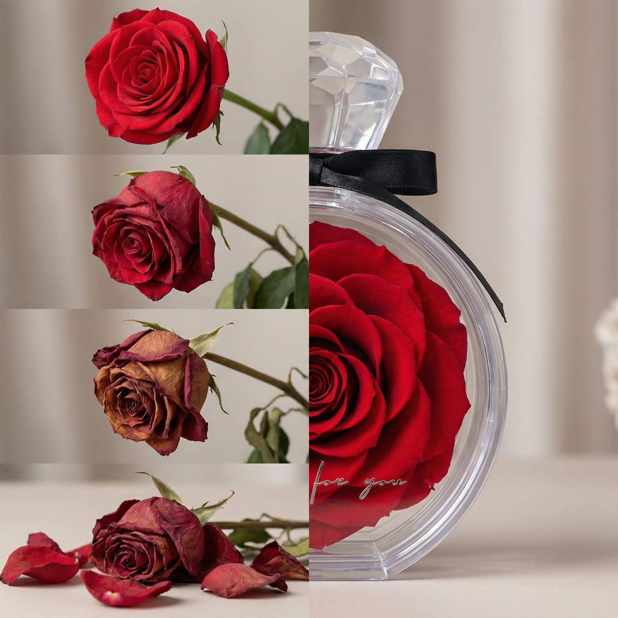 Jede unserer Rosen wird in einer hochwertigen, transparenten Geschenkbox geliefert, die sie schützt und zugleich elegant präsentiert. Das mühsame Einpacken entfällt – du überreichst ein perfektes, stilvolles Geschenk, das sofort begeistert.