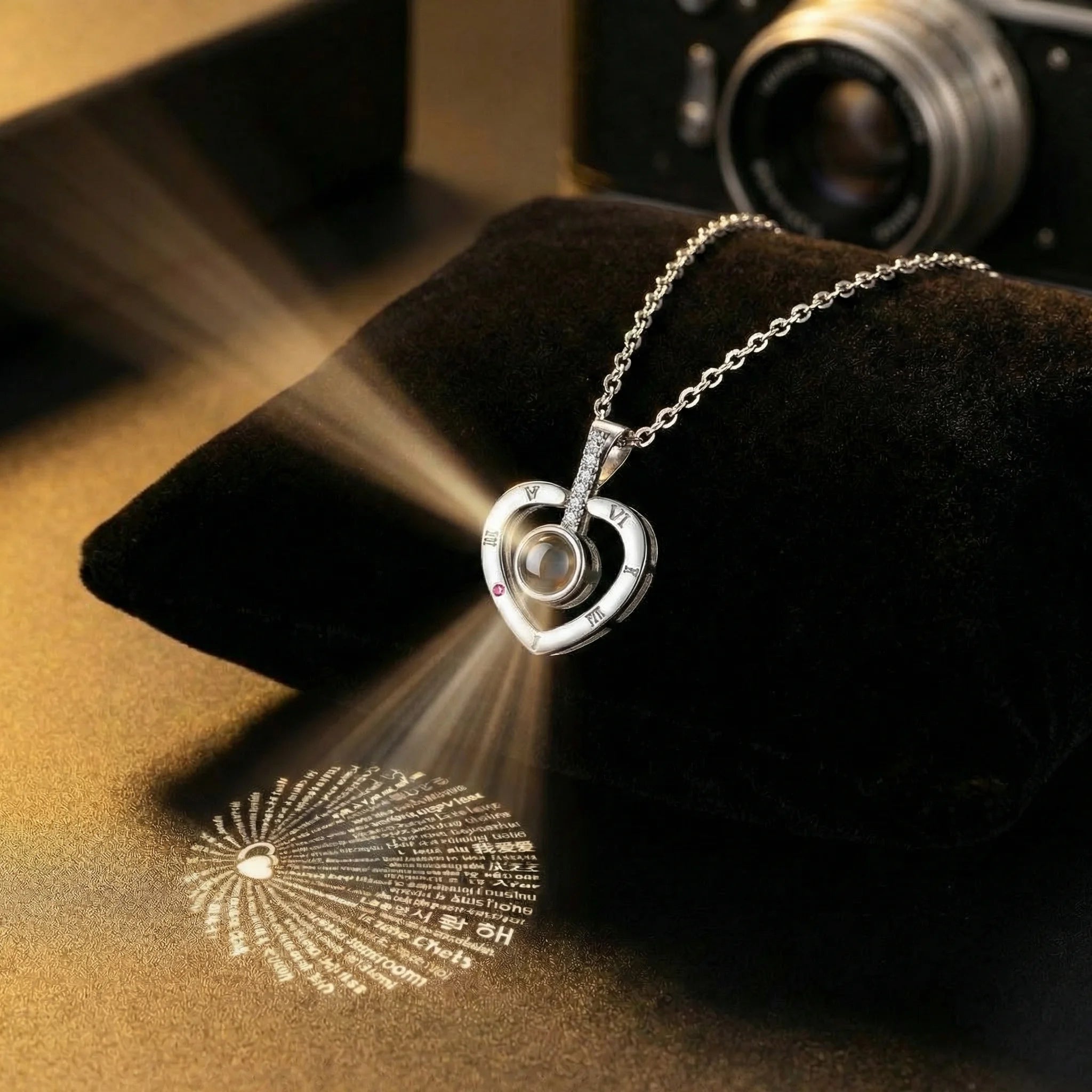 Ein Herz, das mehr sagt als tausend Worte: Die funkelnde Herz-Projektionskette verbirgt eine romantische Botschaft, die „Ich liebe Dich“ in 100 Sprachen projiziert – ein Symbol grenzenloser Liebe und Verbundenheit.