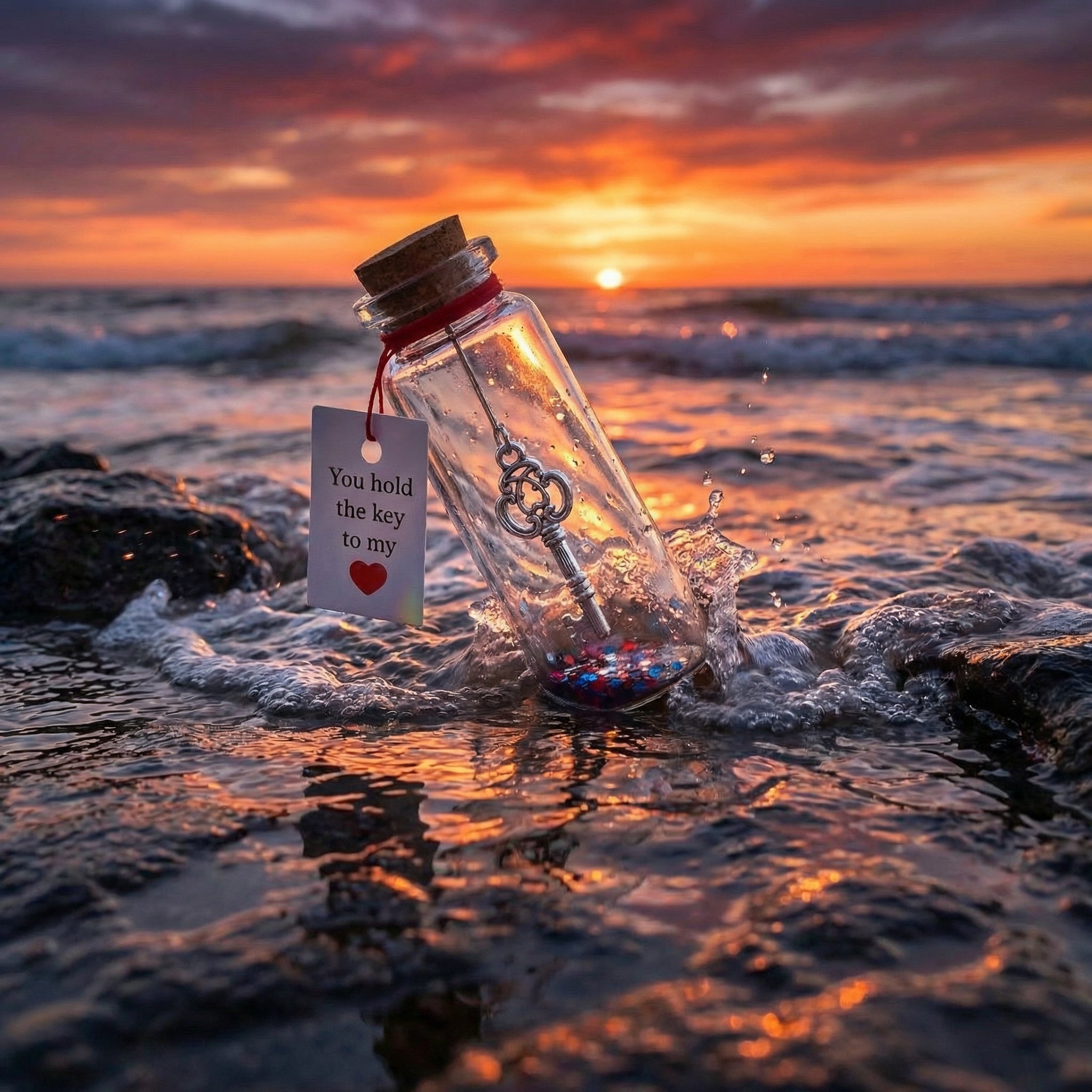Die Flaschenpost ist seit jeher ein Symbol für Hoffnung, Sehnsucht und romantische Botschaften über Distanzen hinweg. Als Anhänger verschenkt, symbolisiert sie: "Meine Liebe erreicht dich immer" und "Du trägst mein Herz bei dir". Es ist ein poetisches Zeichen für die unzerbrechliche Verbindung zwischen zwei liebenden Menschen.